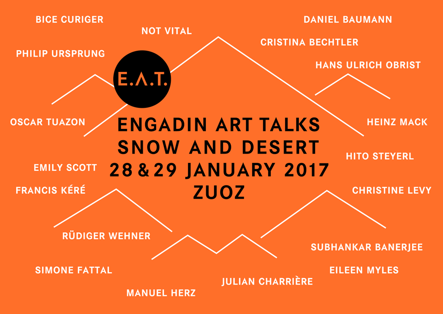 Bereits zum sechsten Mal findet das Kunst- und Architekturforum E.A.T./Engadin Art Talks am Wochenende des 28. und 29. Januar 2017 in Zuoz im Engadin statt. In diesem Jahr heisst das Thema «Snow and Desert»/«Schnee und Wüste».