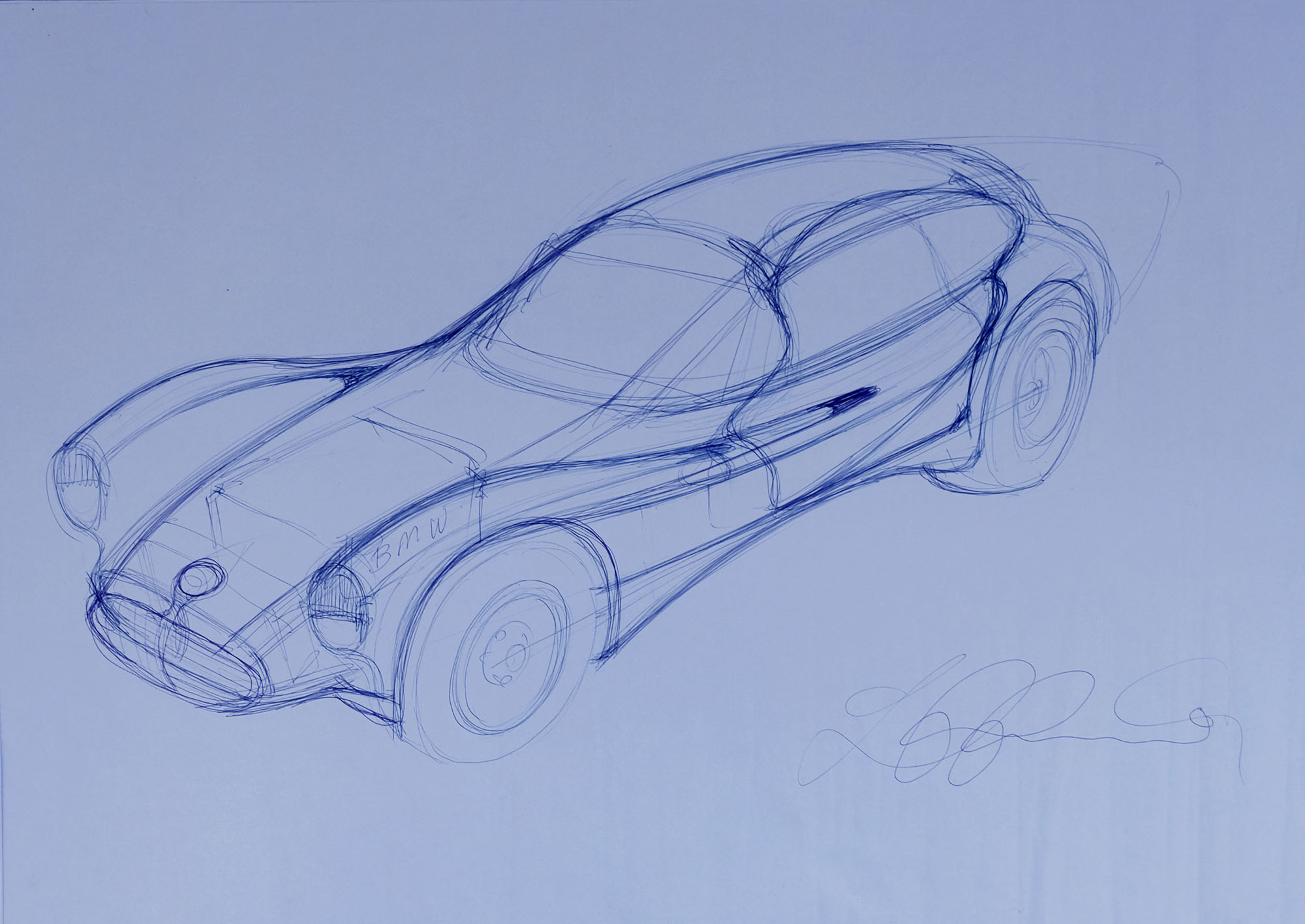 Bild: Skizze eines BMW-Sportwagens, © Luigi Colani – Foto: © Edouard Rieben,Biel/Arles, http://www.edouardrieben.ch/kontakt.html (Bild zur Vergrösserung anklicken)
