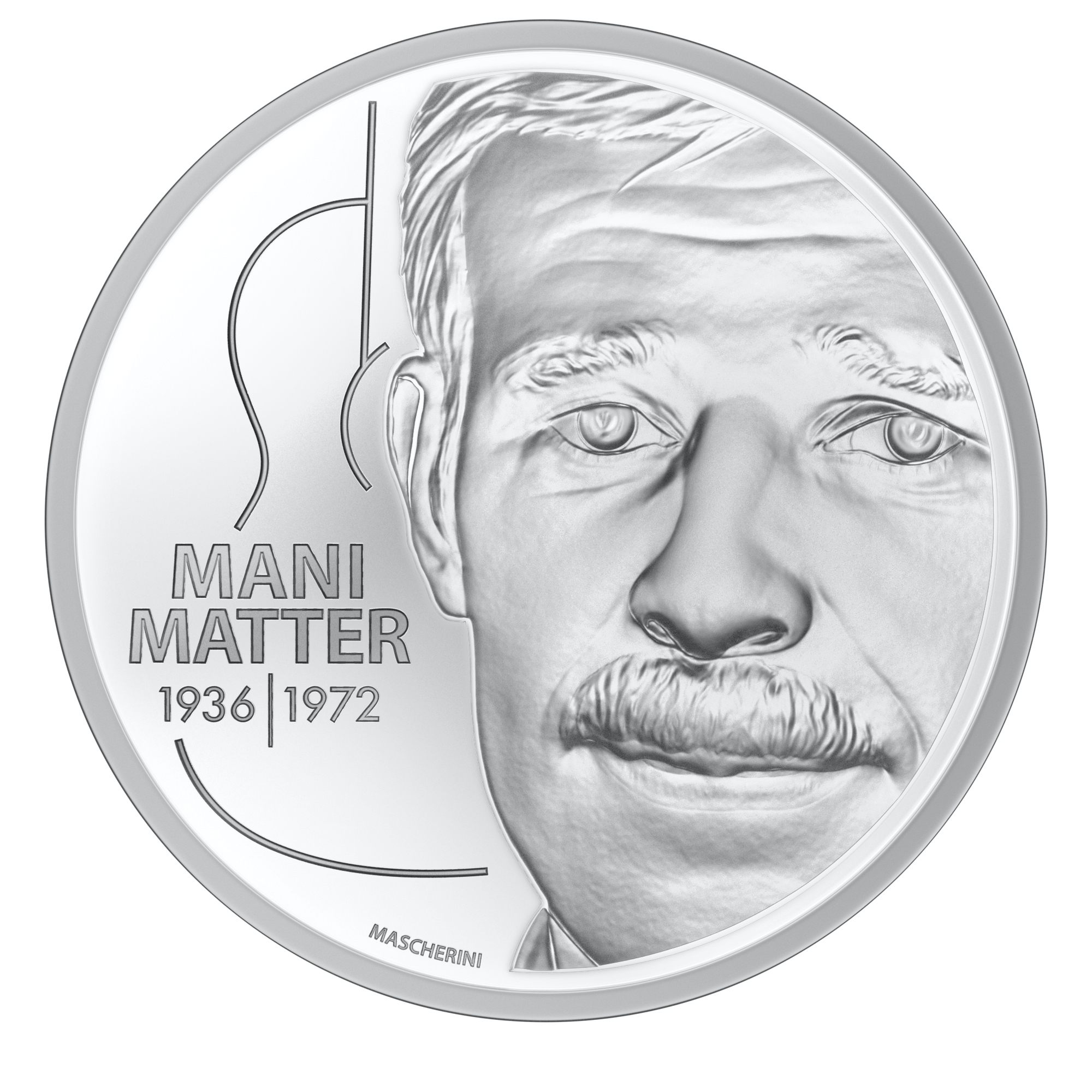 «Die Bildseite der 20-Franken-Silbermünze ‚Mani Matter‘ zeigt auf der rechten Seite des Münzbildes einen Bildausschnitt des Gesichts von Mani Matter mit seinem prägnanten Schnurrbart. Sein Blick zielt direkt auf den Betrachter. Auf der linken Seite stehen sein Vor- und Nachname auf zwei Zeilen sowie das Geburts- und das Todesjahr getrennt durch einen vertikalen Strich. Umrandet wird die Typografie von einer halb angedeuteten Gitarre. Die Gestaltung der neuen Sondermünze erfolgte durch den Graveur der Swissmint Remo Mascherini.