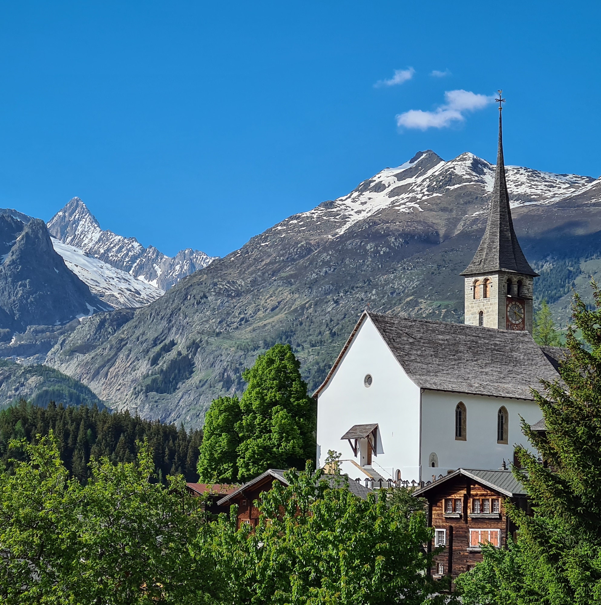 Bild: Kirche in Ernen mit Finsteraarhorn, 2020, Karlofatalo (Ausschnitt) – Lizenz: