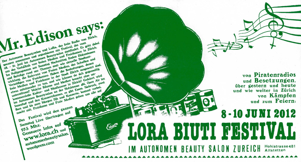 Von Piratenradios und Besetzungen, über Gestern und Heute und Wie-weiter-in-Zürich, von Kämpfen und - zum Feiern: Der autonome Beautysalon und LoRa, das freie Radio von Zürich, spannen zusammen und organisieren ein Festival, das vom 08. bis 10. Juni 2012 im Autonomen Beautysalon stattfindet.