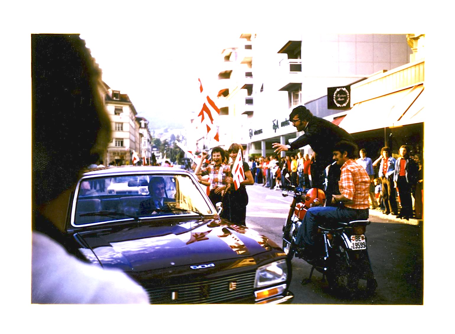 Bild: Roland Béguelin acclamé, Delémont, 24 juin 1974. Photo: anonyme. Archives cantonales jurassiennes