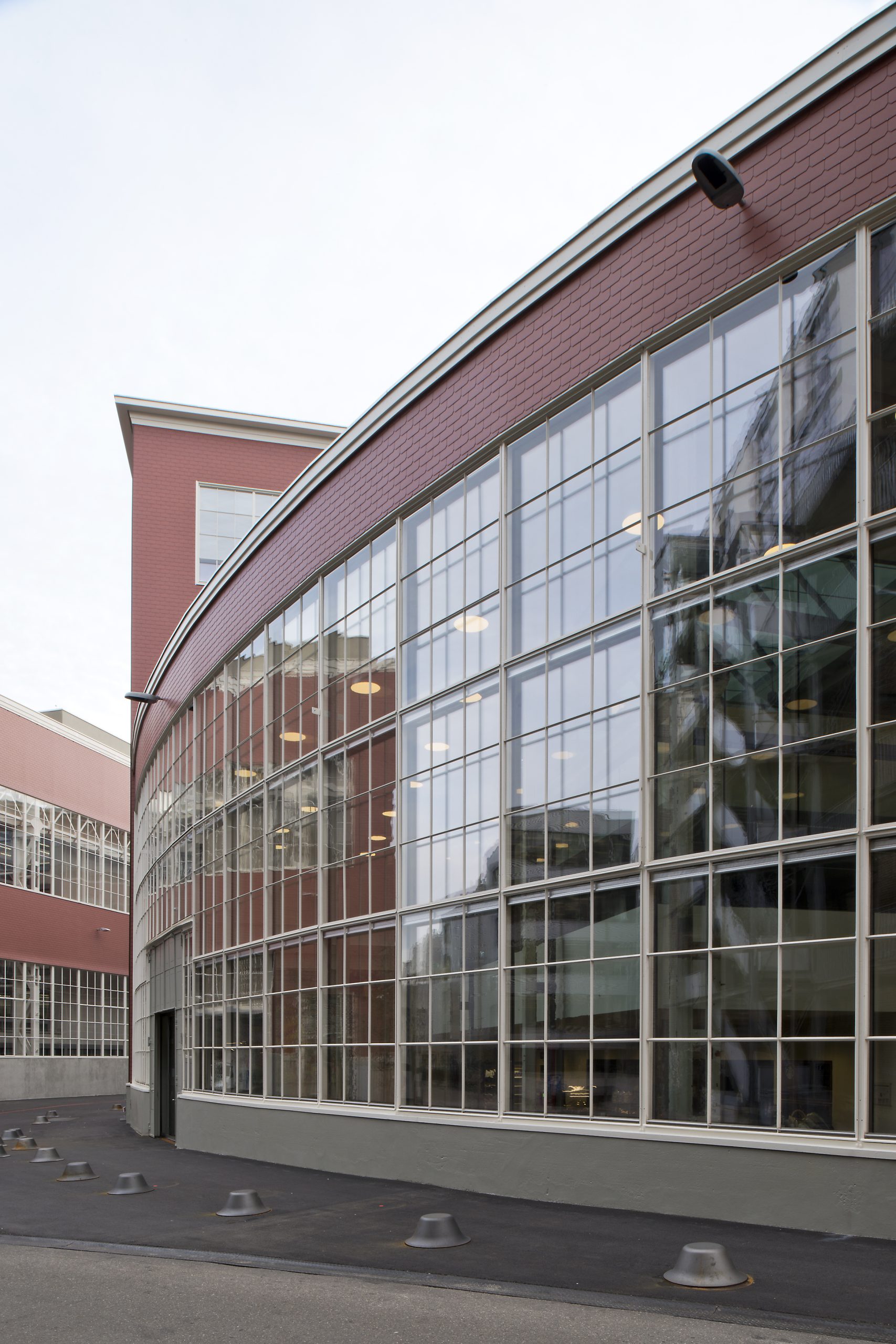 Drei Geschosse mit ganzflächigen Fensterfronten der Halle 87 der ehemaligen Produktionsstätte bilden die Voraussetzung für einen massgeschneiderten Bibliotheksausbau. Unter weitgehendster Erhaltung des ursprünglichen Tragwerks – einer Stützen- und Trägerkonstruktion aus genietetem Stahl – erfolgte die innere Verdichtung.