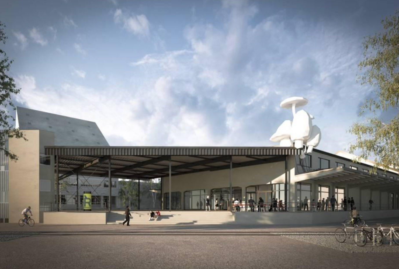 Bild: Visualisierung Freilager-Platz 8-10, von links: Bürogebäude Blechspitz; gedecktes Foyer mit Freitreppe; Haus der elektronischen Künste Basel (EG & UG) und iaab im OG.