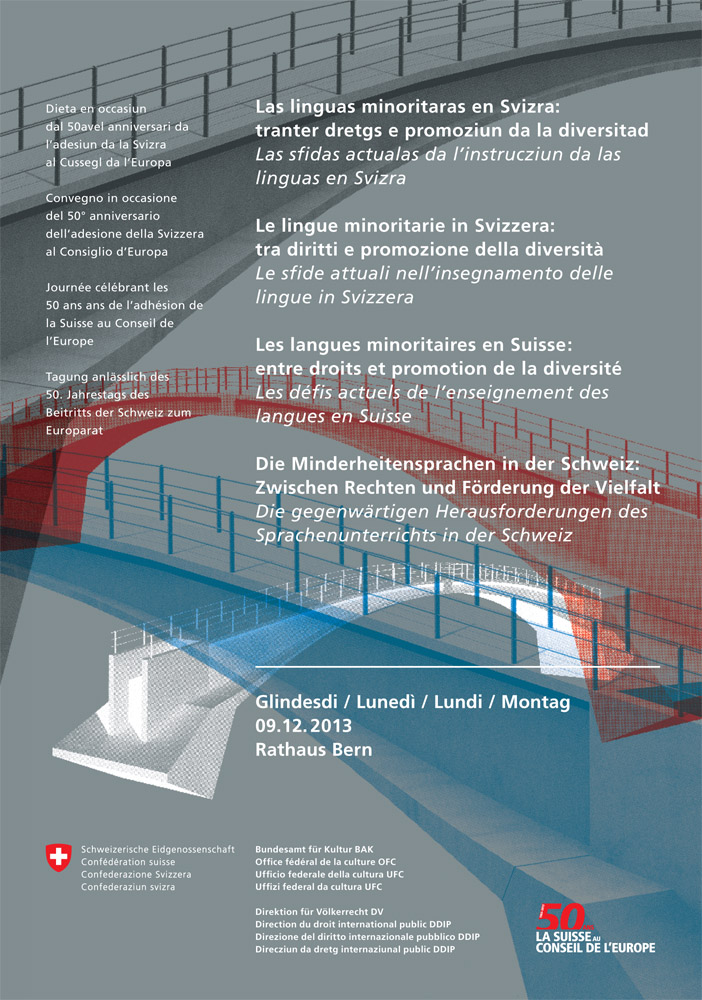 Anlässlich des 50. Jahrestags des Beitritts der Schweiz zum Europarat organisieren das Bundesamt für Kultur und die Direktion für Völkerrecht am 9. Dezember 2013 in Bern eine Tagung über die Minderheitensprachen und die Förderung der kulturellen Vielfalt in der Schweiz.