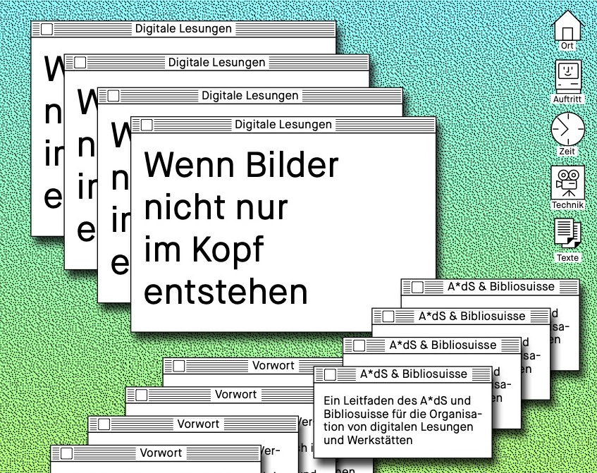 Der Leitfaden wurde vom Verband A*dS Autorinnen und Autoren der Schweiz und dem Bibliotheksverband Bibliosuisse gemeinsam erarbeitet. Das Merkblatt «Wenn Bilder nicht nur im Kopf entstehen – Ein Leitfaden des A*dS und Bibliosuisse für die Organisation von digitalen Lesungen und Werkstätten» liegt dreisprachig in digitaler Form (und als Version zum Selberausdrucken) vor.
