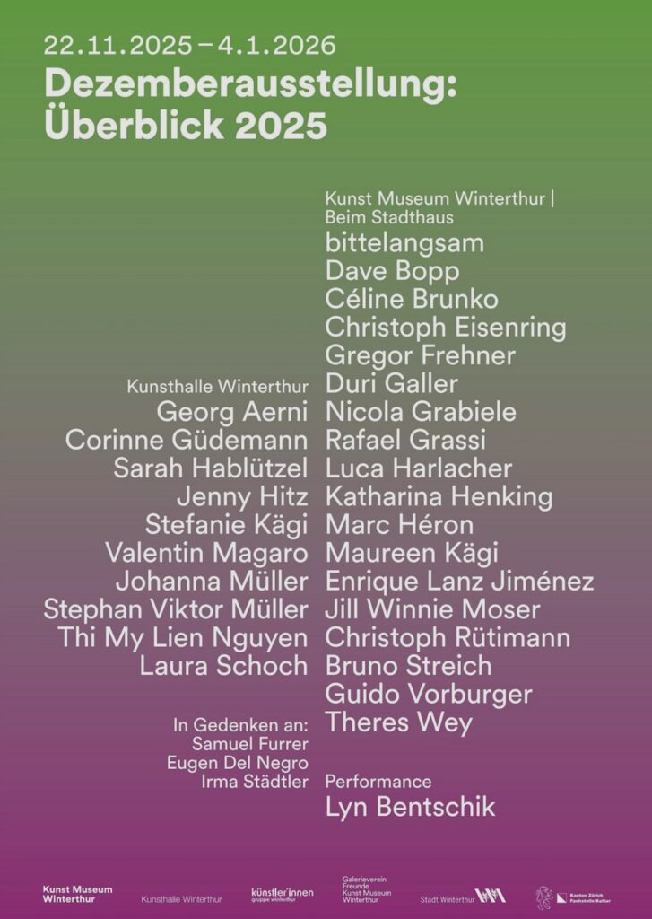 Ab dem 22. November 2025 und bis am 4. Januar 2026 sind im Kunst Museum Winterthur und in der Kunsthalle Winterthur anlässlich der «Dezemberausstellung: Überblick 2025» Werke von 29 Kunstschaffenden mit Bezug zur Region Winterthur zu sehen. Eine Fachjury wählte diese aus rund 120 Bewerbungen aus. Anlässlich der Vernissage am 22. November wird der mit CHF 10’000.- dotierte «Preis Galerieverein. Freunde Kunst Museum Winterthur» vergeben.