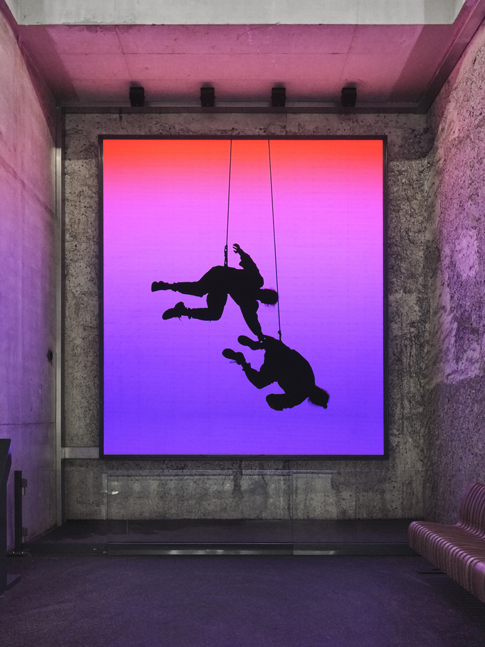 Actuellement visible à Chêne-Bourg, Angelica Mesiti présente «Sidereal» dans l’alcôve de la gare. Cette œuvre met en scène deux danseuses et danseurs, suspendu-e-s devant un fond coloré, dont les mouvements évoquent une trajectoire céleste.