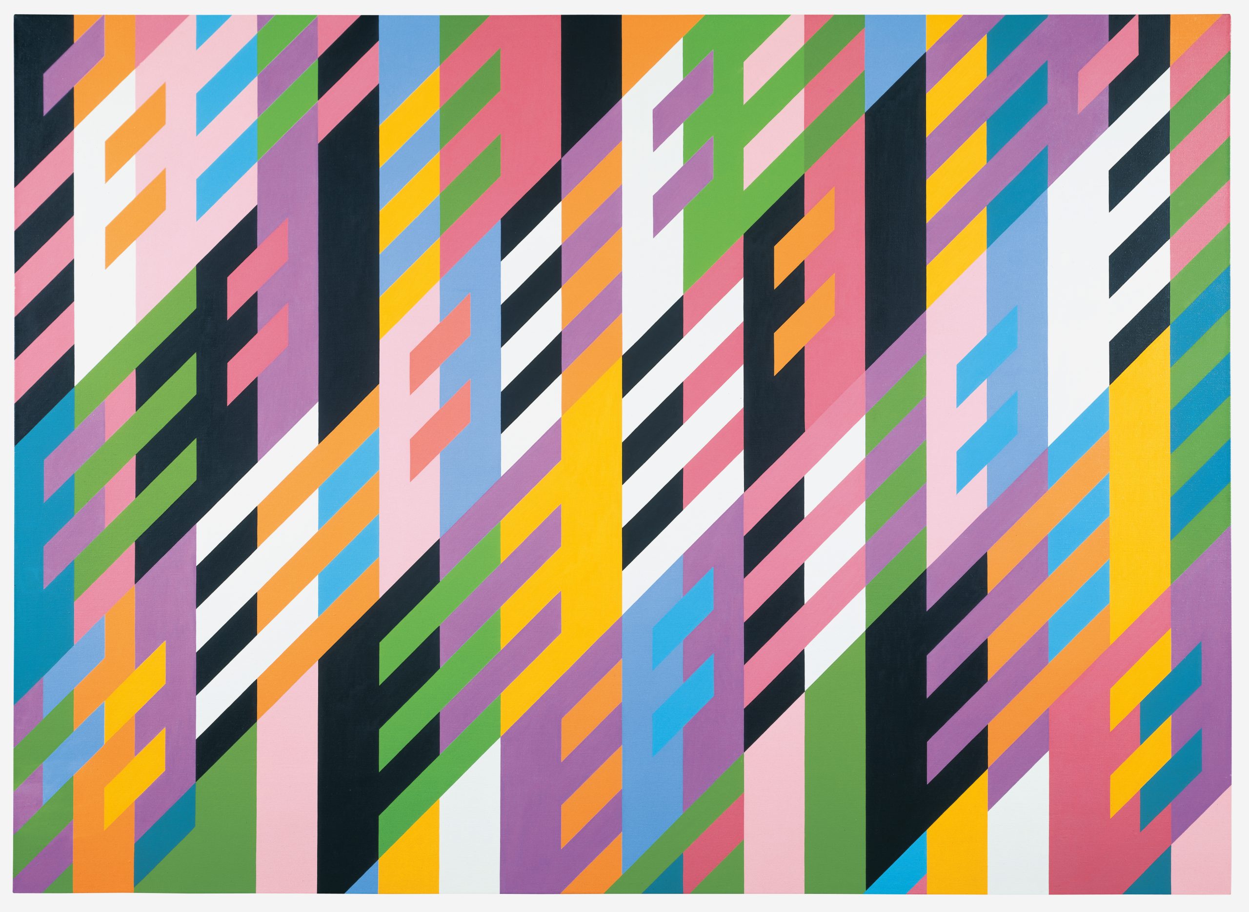 Die Ausstellung beginnt mit den Streifenkompositionen der frühen 1980er-Jahre, die auf Grundlage der «ägyptischen Palette» entstanden sind, und zeigt auf, wie dieser künstlerische Wendepunkt bis in die frühen 2000er-Jahre in Rileys Schaffen nachwirkt. Diagonalen fliessen in das Streifenfeld ein, neue Strukturen entstehen, der Bildraum gewinnt an Tiefe, die Farbpalette erweitert sich – und eine neue Bildsprache bildet sich heraus.