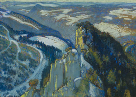 Image: Charles L’Eplattenier, Rochers des Sommêtres et le Doubs, vers 1915 (?). Pastel sur papier, 41 × 27,5 cm. Collection privée