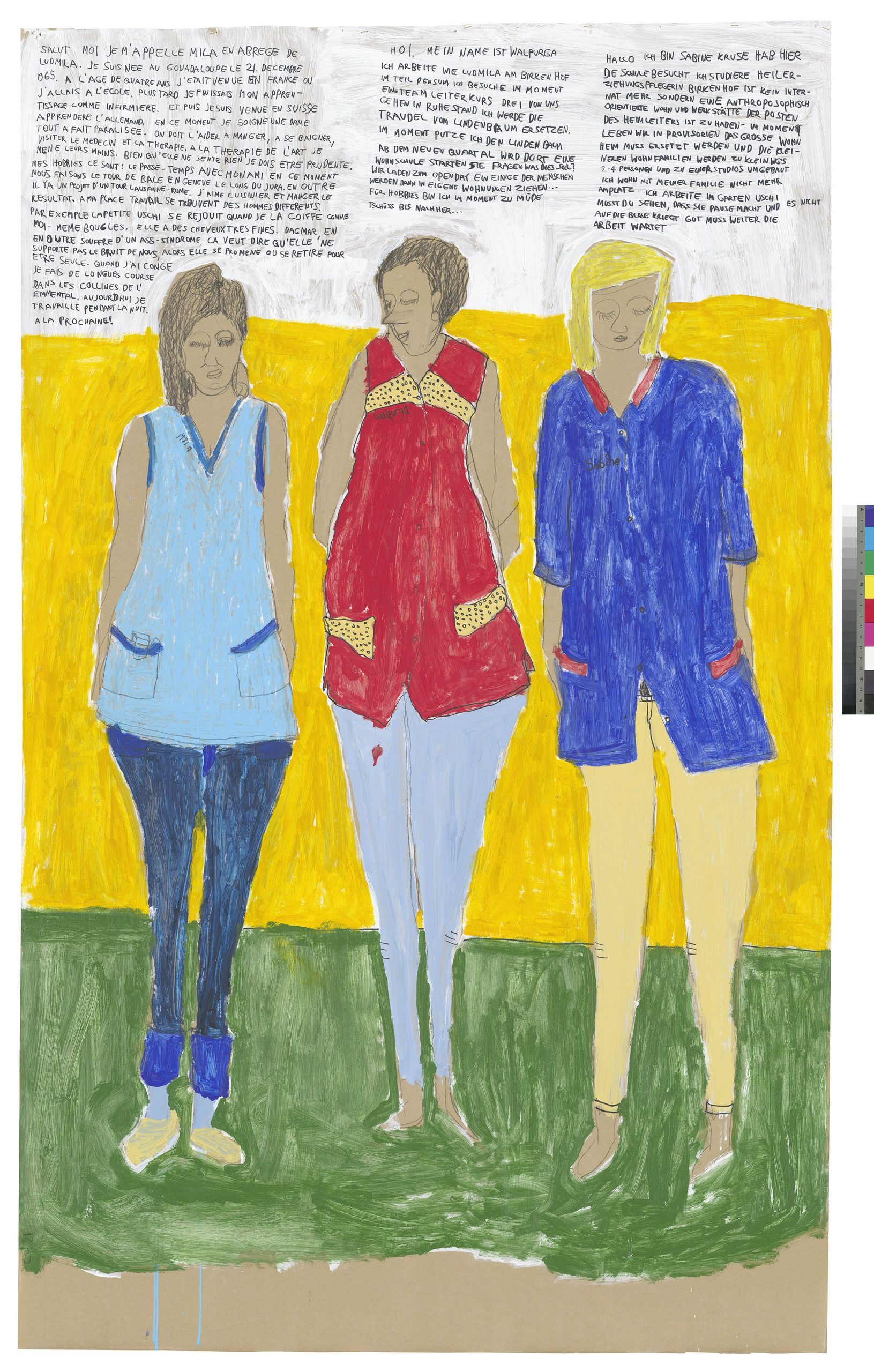 Image: Clemens Wild, Mila, Walpurga, Sabine, 2021, minę de plomb, crayon de couleur, feutre et peinture acrylique sur papier, 220 x 135 cm – Atelier de numérisation, Ville de Lausanne (AN) – Collection de l’Art Brut, Lausanne