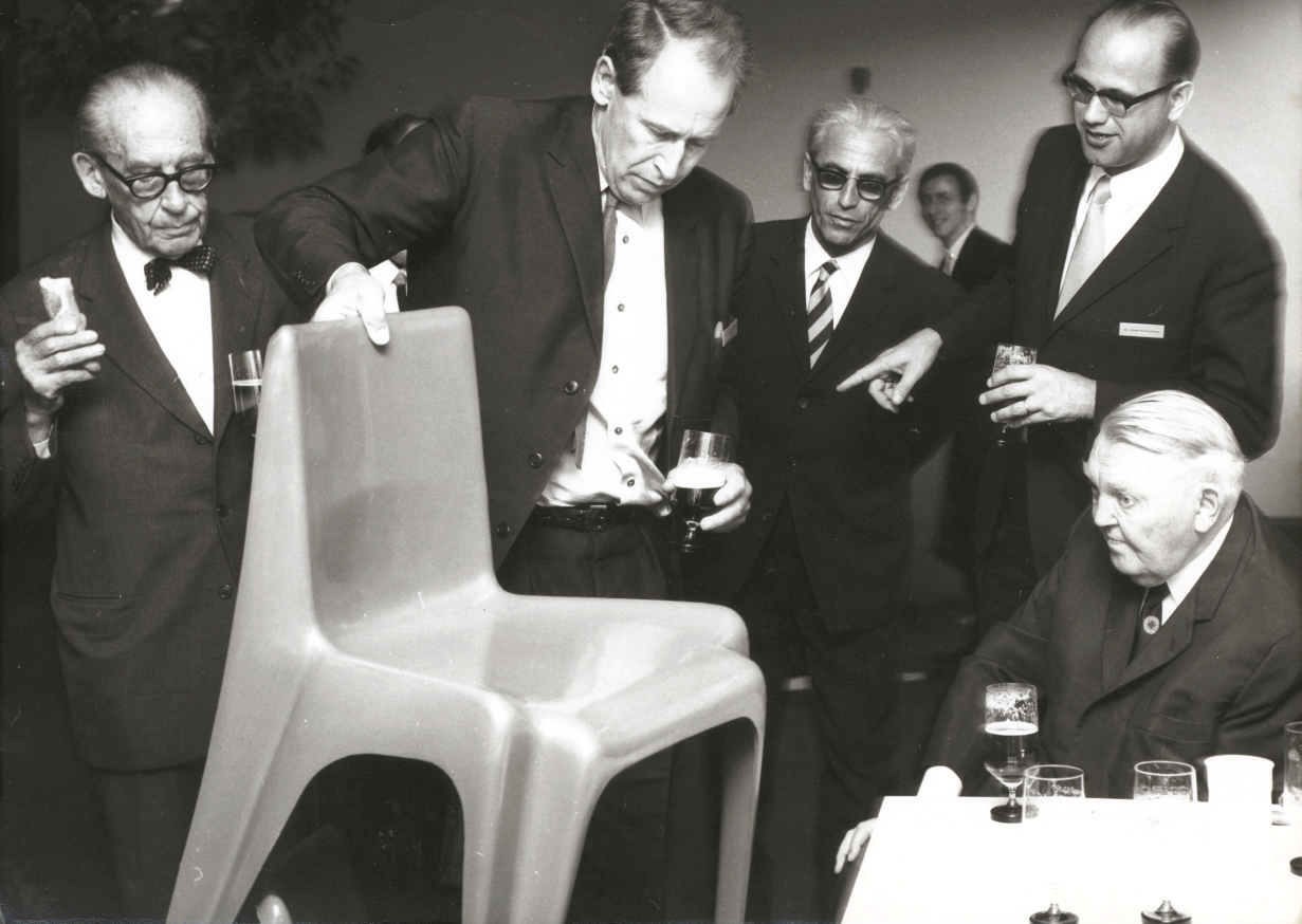 Bild: Philip Rosenthal präsentiert dem ehemaligen Kanzler Ludwig Erhard und Walter Gropius den Bofinger-Stuhl, Gewinner des Rosenthal Studio Awards 1966, © Rosenthal GmbH und Historisches Fotoarchiv des Rats für Formgebung, Frankfurt am Main