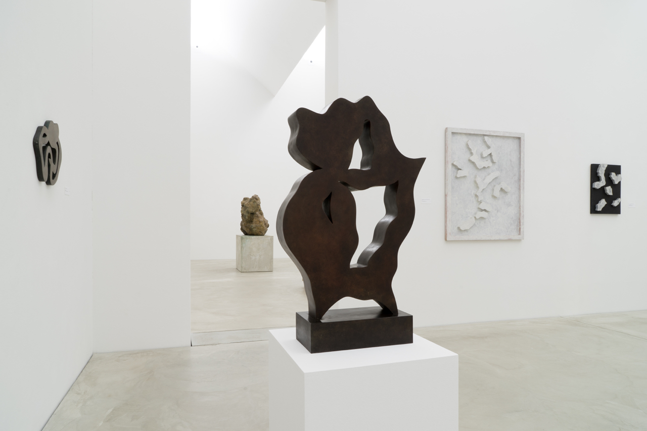 Am Ende der Ausstellung stehen Werke der Nachkriegszeit. In dieser Periode schlug Arp in der Bemalung der Reliefs eine überraschende Brücke vom Prinzip des Zufalls zum zeitgenössischen Informel. In den Skulpturen experimentierte er mit der Wirkung verschiedenster materieller Ausführungen.