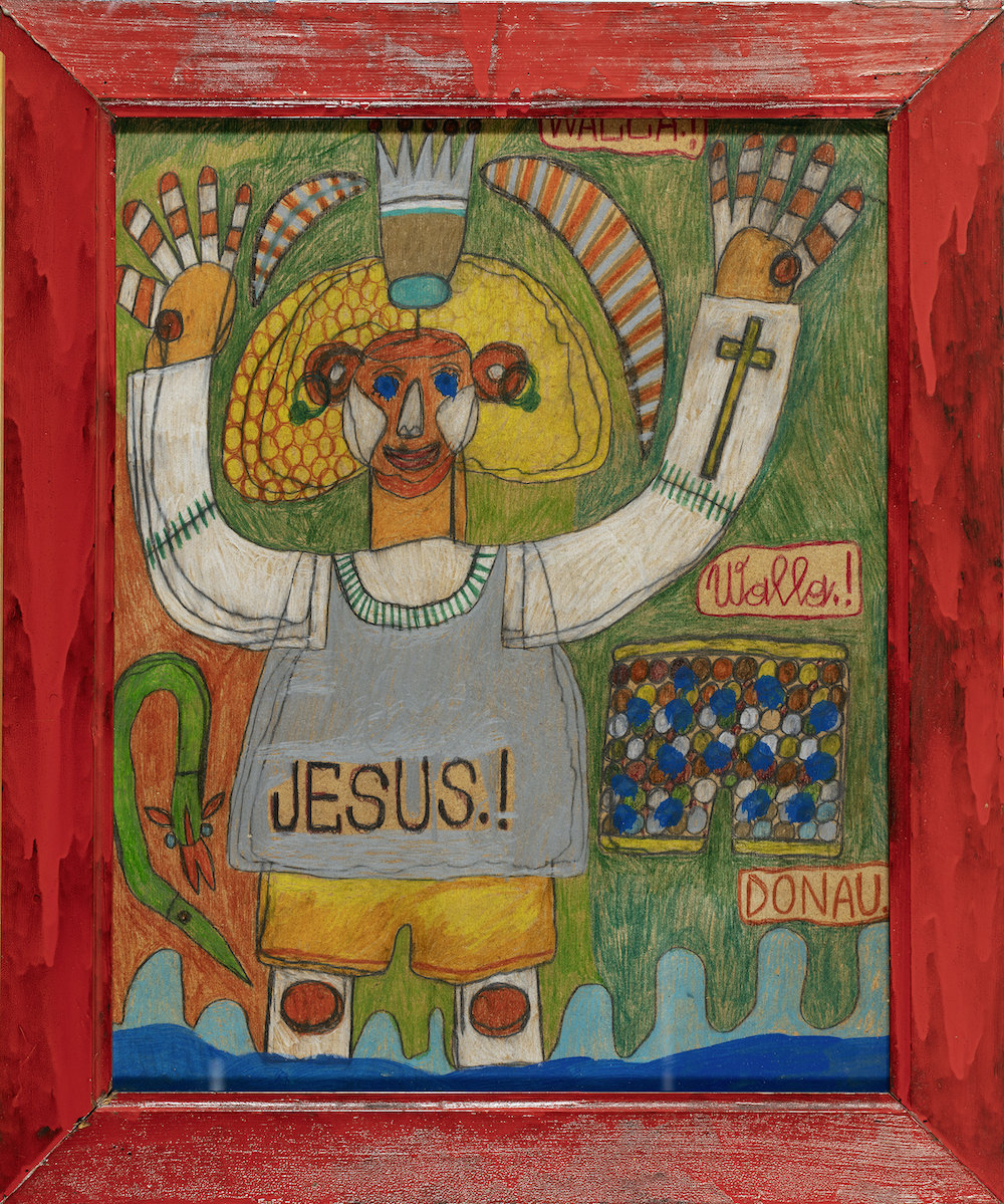 Bild: August Walla, «Jesus in der Donau», 2001, Bleistift und Farbstifte auf Papier, 53×42,7 cm, © Kunstmuseum Thurgau, https://kunstmuseum.tg.ch/