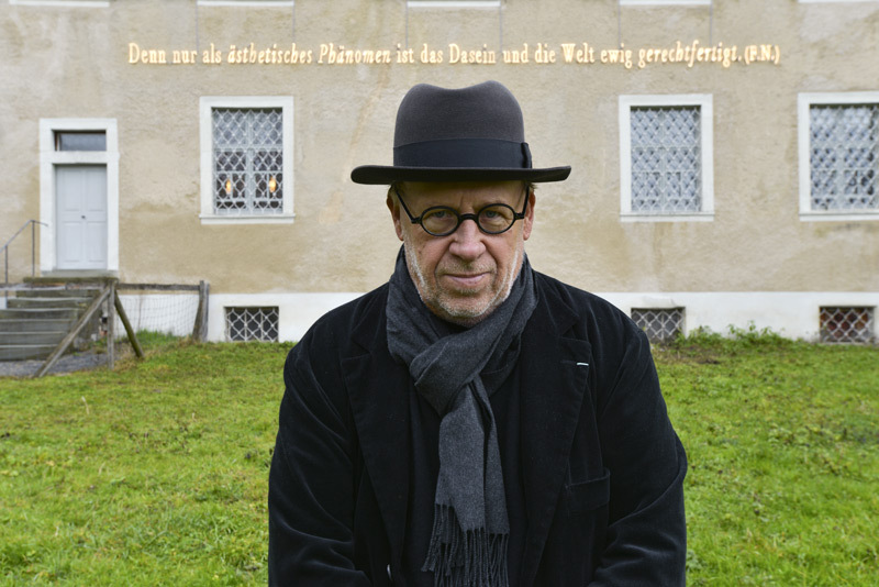 Bild: Der Künstler Joseph Kosuth vor der Leuchtschrift an der Fassade der Kartause Ittingen, 2014 – Fotografie: © Mirjam Wanner