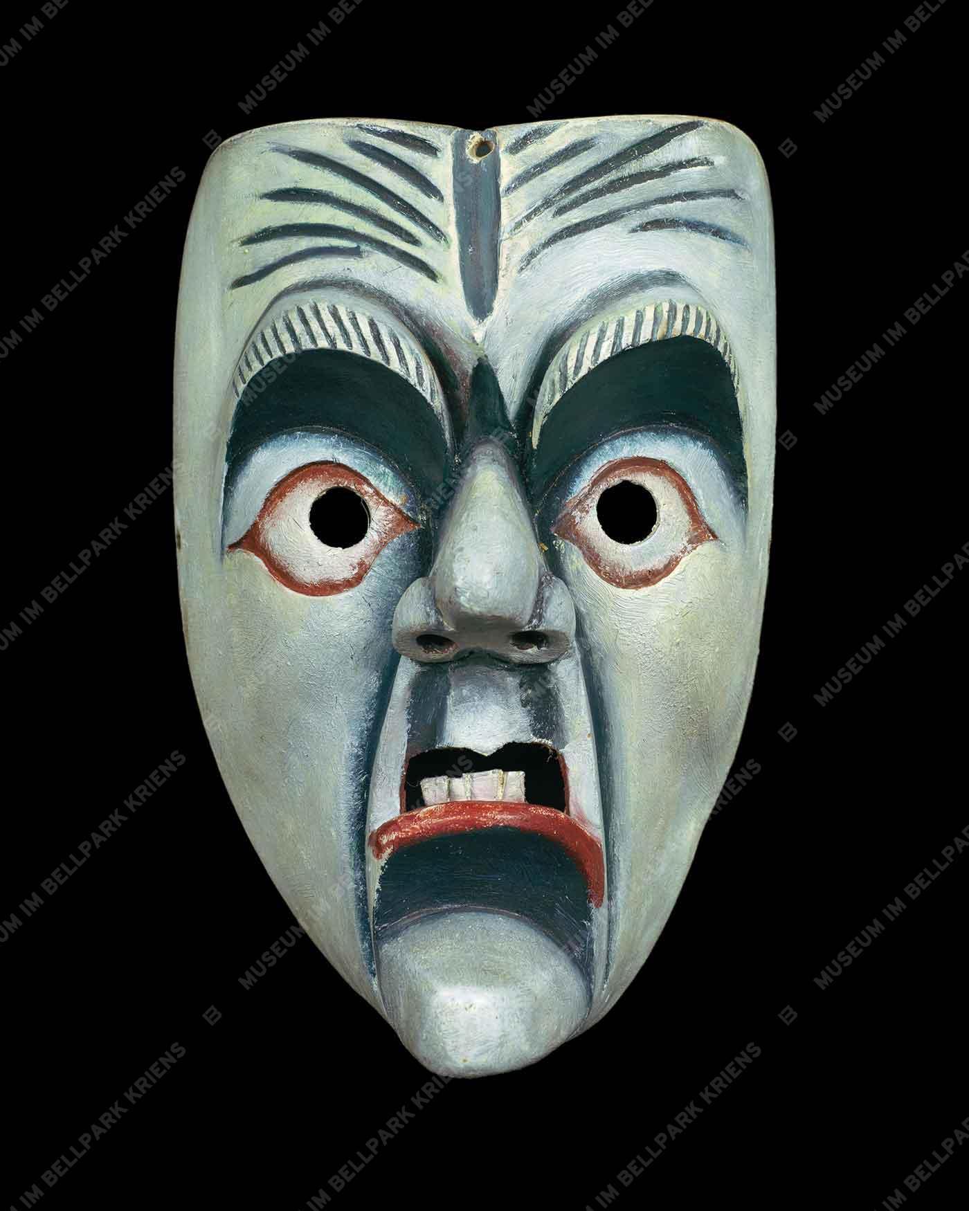 Bild: Krienser Fasnachtsmaske, Schreckmaske (blaugrau), Schnitzer: Rolf Hager (1940 – 2007) Kriens, vor 1970, H 22 cm, B 15 cm, Holz, bemalt, Sammlung Ottiger Robert (MiB) SOR000007, alte Signatur: OR I – Foto: © https://www.bellpark.ch/kriensermasken/