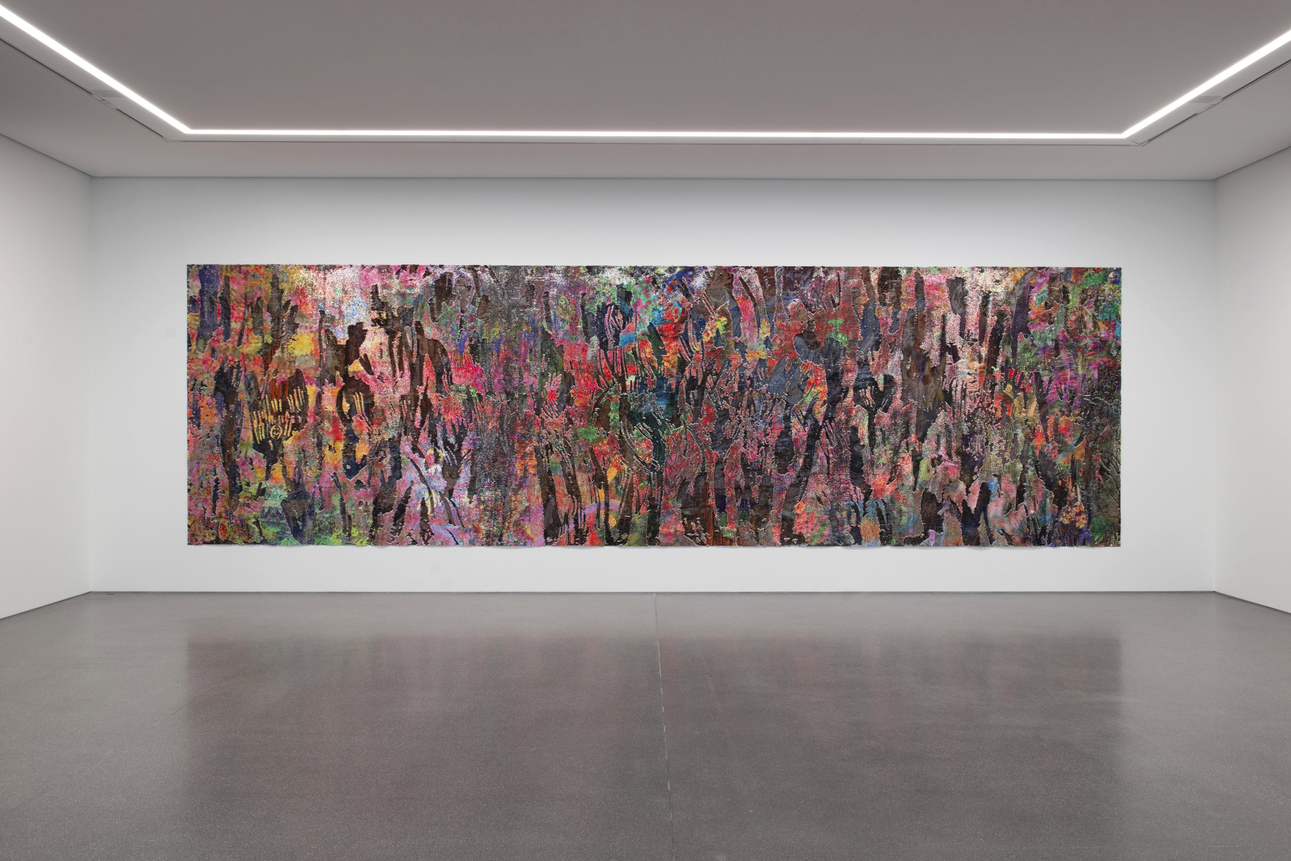 In der Ausstellung im Bündner Kunstmuseum zeigt Olga Titus ihr bisher grösstes Werk aus Pailletten. Die schimmernden Pailletten bedruckt sie beidseitig und gestaltet die Bildkomposition, indem sie mit der Hand über die Pailletten fährt und an ausgewählten Stellen dreht. Die Künstlerin beschreibt das Kippen von Pailletten als malerische Geste und sagt dazu, dass die Umsetzung ihrer Bilder nie ganz abgeschlossen sei. Je nach Lichteinfall wandelt sich das Farbenspiel, je nach Berührung richten sich die Pailletten neu aus. Grundlage dieser Werke sind digitale Collagen, die sich aus Bildern aus dem Internet zusammensetzen.