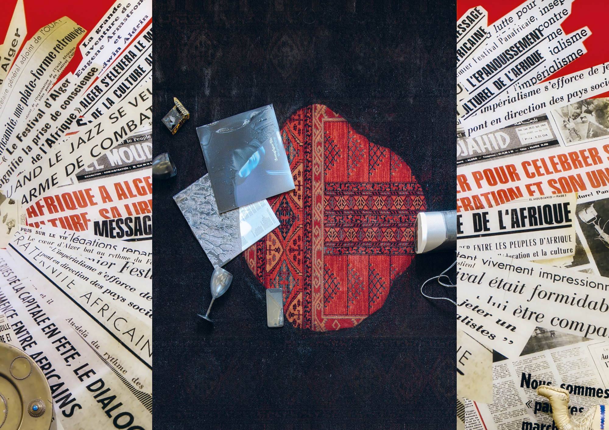 Bild: 220405_KunsthausBL_Latifa&Zineb – Latifa Echakhch, Several times, you’re so cool, 2019 wool carpet, ink, Sonos loudspeaker, Jonathan Bree Sleepwalking vinyl record, Parisienne yellow cigarette pack, two wine glasses, iPhone 240 × 160 cm, unique Courtesy the artist and Dvir Gallery. Zineb Sedira, For a Brief Moment the World Was on Fire … and We Have Come Back (detail: Les UNES (journaux Algériens), 2019 © Zineb Sedira / DACS, London Photo: archives kamel mennour Courtesy the artist and kamel mennour, Paris