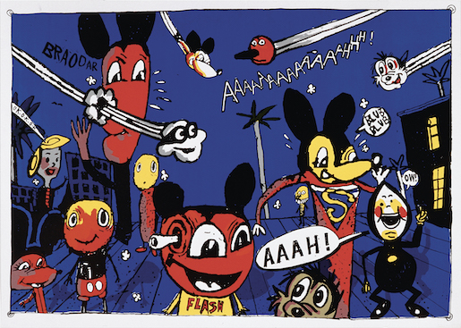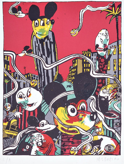 Im Erdgeschoss sind verschiedene Figuren zu sehen, die immer wieder auftauchen. «Bastian-World» (1996), die «Selbstporträts» (2000) oder das Blatt «Rendez-vous des amis» (2003) versammeln einige davon in unterschiedlichen Szenarien. Darunter Mickey Mouse und «Pulp», der bereits im Neubau seinen grossen Auftritt hat. Die eher kleinformatigen Werke handeln von seinen Abenteuern: Er fährt im «Pulpmobil» (um 2005) oder mit der M.S. Bastian («Nur der See kann ich treu sein», 2010) und erzählt von seinen Erlebnissen in den «Gutenacht-Geschichten» (2004). Mickey Mouse, die wohl berühmteste Zeichentrickfigur der Welt, erscheint auf mehreren Blättern. Sie wir hier allerdings nicht als süsse, lustige Maus dargestellt, sondern vielmehr als ein zu Aggression und Gewalt neigender Verrückter. Dies könnte eine Hommage an Roy Lichtenstein (1923–1997) sein, der als erster Motive des Comic, insbesondere Mickey Mouse, in der Malerei zitierte. Es könnte aber auch als eine Anspielung auf die erste grosse Arbeit des von M.S. Bastian und Isabelle L. gleichermassen geschätzten Underground Comic-Autors Art Spiegelman verstanden werden. In seinem Comic «Maus. A Survivor’s Tale» («Maus – Die Geschichte eines Überlebenden» 1980-1991), das die Geschichte seines Vaters, eines Holocaust-Überlebenden, in Form einer Fabel erzählt, werden die Juden als Mäuse, die Deutschen als Katzen, die US-Amerikaner als Hunde dargestellt. Viele Werke reflektieren zudem die Atmosphäre der Grossstadt und betonen das Absurde und Groteske der Menschenmassen, der Hektik, der Gewalt wie etwa «Tuur-Tuut», (1995) oder «Wää – Ping – Socko» (1995).