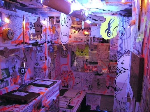 Im Zentrum der Installation thront «Pulp» – die von M.S. Bastian in den frühen 1980er-Jahren eingeführte Comicfigur, die auch in den gemeinsam mit Isabelle L. geschaffenen Werken immer wieder vorkommt und inzwischen zum Markenzeichen des Künstlerdous geworden ist. Lebensgross sitzt er in der Mitte des Raumes an einem Tisch, vor sich eine Flasche Tequila der Marke «Super Pulp». Wie der Titel «PULPOKOSMOS« suggeriert, ist »Pulp» sowohl Meister dieses Universums als auch dessen Hauptfigur. Gemalten Plakaten entnehmen wir, dass er eine Hauptrolle spielt in Filmen wie «King Kong – directed by M.S. Bastian / Isabelle L.», «Stoned Pulp Rät» oder «Attack of the Crack Pulp Monster». Er tritt aber auch als Superman auf und singt in einer Band mit dem Namen «Led Pulp». Er schleicht sich auf umgedeutete Covers von Comic-Klassikern wie Hergés «Tintin in Amerika» oder «Le Lotus Bleu» (vgl. «Le Lotus Pulp»). Und zur Entspannung macht er ganz zeitgemäss Yoga.