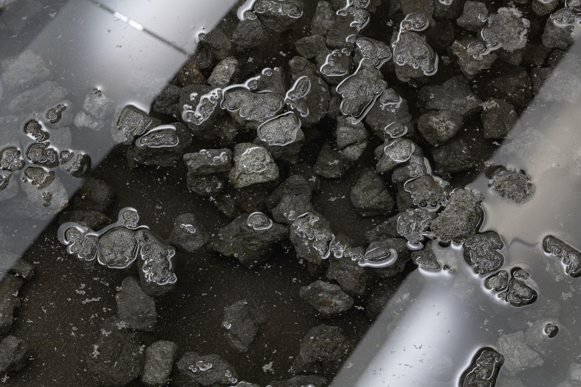 Bild: Miriam Sturzenegger, What Remains (Black Line), 2020, Steinkohlenkoks, Wasser, Salz, EPDM Gummimatte, Holz – Courtesy the artist – Foto: Stefan Rohner