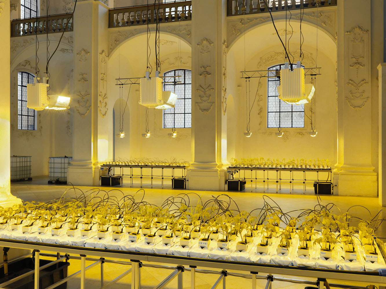 La création de cette installation trouve son origine dans la profonde interaction entre l’histoire du lieu et les événements régionaux. Mirko Baselgia s’en inspire pour construire une narration autonome dans laquelle il lie l’héritage spirituel de l’abbatiale, lequel existe toujours et véhicule la représentation chrétienne du paradis malgré sa sécularisation, à des mythes de la création venus d’Extrême-Orient ainsi qu’à des promesses de paradis contemporaines pour en extraire un commentaire social et politique pointu.