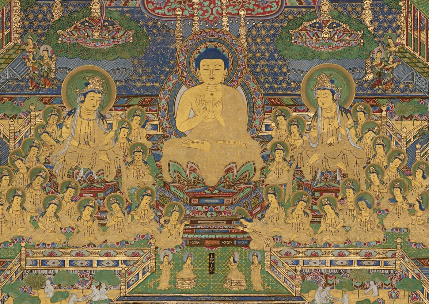 Bild: Taima-Mandala (Detail), Japan, Edo-Zeit, 18. Jahrhundert, Tusche und Farben auf Seide © Museum Rietberg, Geschenk Heinz Brasch