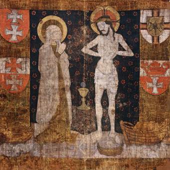 Bild oben:Mit dem Pinsel farbig bemalte und mit Modeln bedruckte Fahnen wurden frei im Kirchenraum aufgehängt. Die Stifter werden hier durch Wappen von drei Hansestädten im Deutschordensland repräsentiert. Sie hoffen auf die Fürbitte der Gottesmutter bei ihrem Sohn, der als Schmerzensmann erscheint.