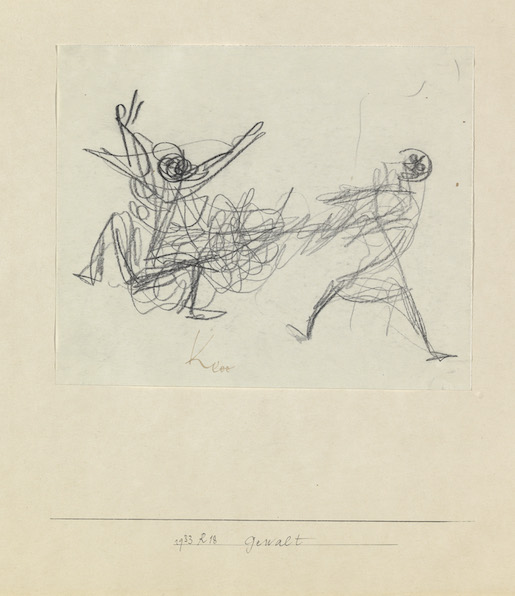 Krieg und Gewalt spiegeln sich auch in einem rund 300 Blätter umfassenden Zyklus von Bleistiftzeichnungen aus dem Jahr 1933, als Klee, von den Behörden «als Jude und als Lehrer für unmöglich und entbehrlich angesehen», von seinem Posten als Professor an der Kunstakademie Düsseldorf entlassen wird und zurück nach Bern zieht. Seine Kunst wird als «entartet» geschmäht; er verliert sein Ansehen und sein Einkommen. Die Zeichnungen bilden eine stilistisch und inhaltlich so geschlossene Gruppe, wie es sie bis dahin im Werk Klees noch nie gegeben hatte. Dargestellt sind Menschen und tierartige Wesen in Situationen der Gewalt, des Militarismus und der Verfolgung. Während in der nationalsozialistischen Propaganda die Errichtung der Diktatur als nationale «Erneuerung» oder «Aufbau» dargestellt wird, zeigt Klee die Ereignisse als Verfall der Gesellschaft, als Bruch mit der Zivilisation und als Rückfall in die Barbarei.