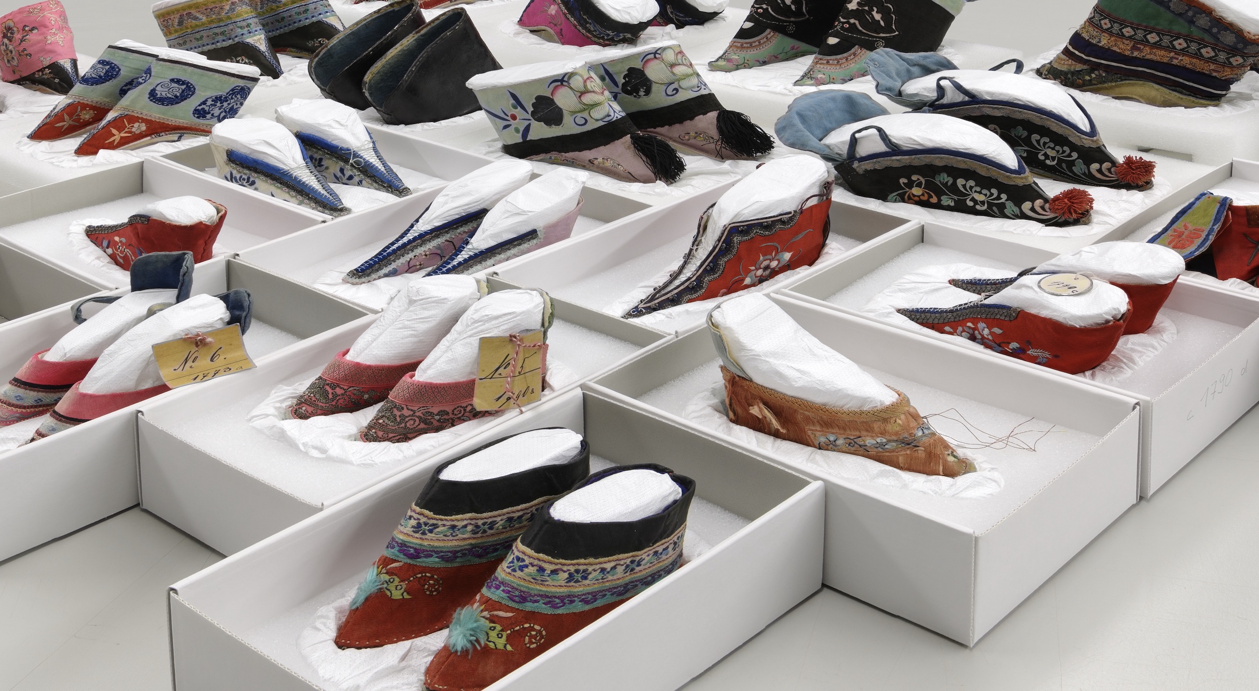 Exemplarisch für das Ende der Ära stehen die überraschend kleinen, spitz zulaufenden Schuhe, die in der Ausstellung in einer freistehenden Vitrine zu sehen sind. Der radikale Wandel reichte bis ins Privateste: Das Binden der Füsse von Mädchen und Frauen – einst Inbegriff von Weiblichkeit in China – wurde verboten. Die zierlichen Schuhe waren nicht länger gefragt. 28 Paar davon finden sich allein im Völkerkundemuseum. Wie sie gesammelt wurden, ist bisher ungeklärt.