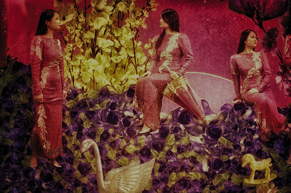 «Tears Of A Swan», so heisst der romantische Blütenteppich, fügt sich bestens zur Videoprojektion «Sweet Noel». Die Künstlerin hat sich selbst elf mal in einen bunten Garten montiert. Während zehn ihrer Alter Egos mit verträumten Gesichtsausdruck oder gesenktem Blick stehend, sitzend oder liegend posieren und auf ihren Einsatz warten, gibt die elfte mit zarter Stimme die Sängerin. Die Frauen tragen alle dasselbe elegante, pinkfarbene Kleid – die kunstseidene Version eines traditionellen vietnamesischen Gewandes.