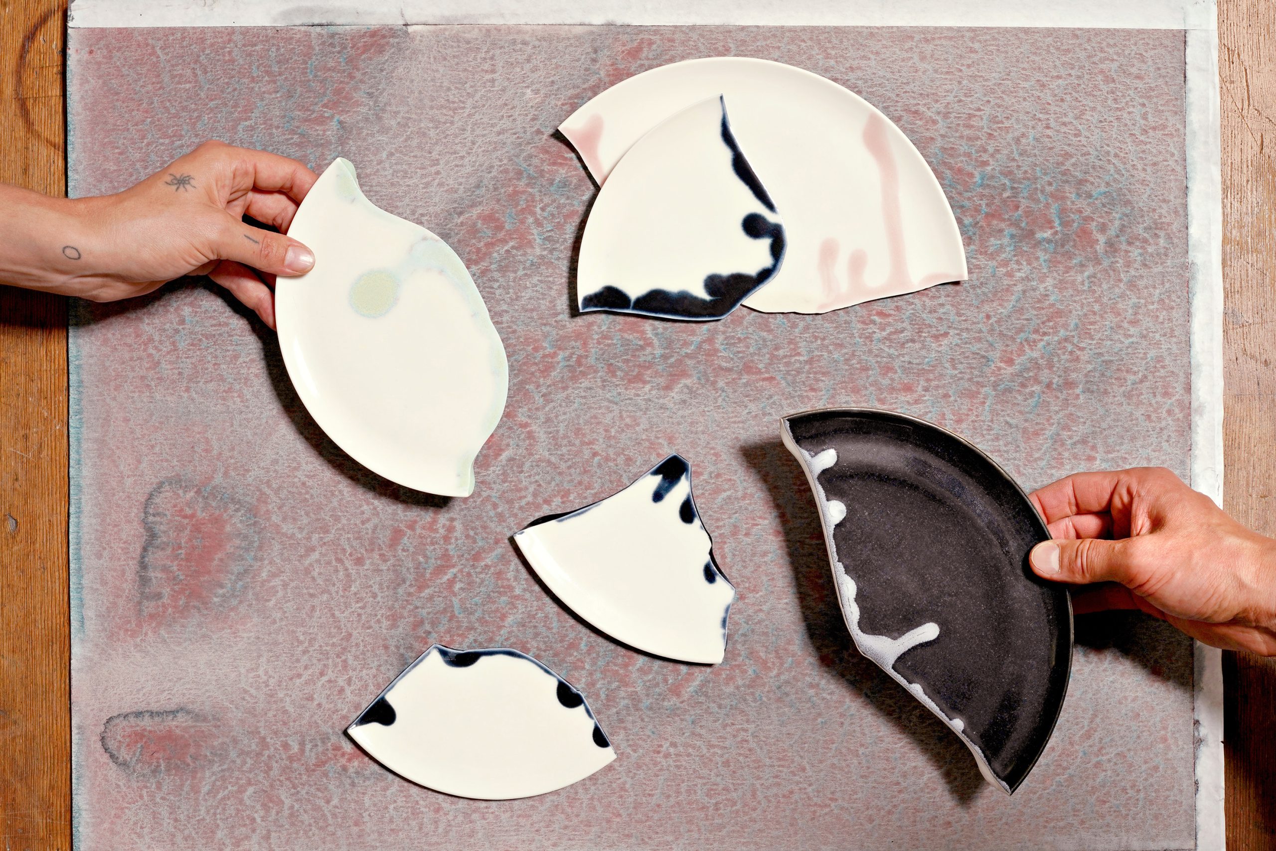 Bild: goodlife ceramics, Scherben, Tellerstücke neu glasiert für Maison Manesse, Zürich, 2017–2023, Foto: Stefan Burger/Aio Frei