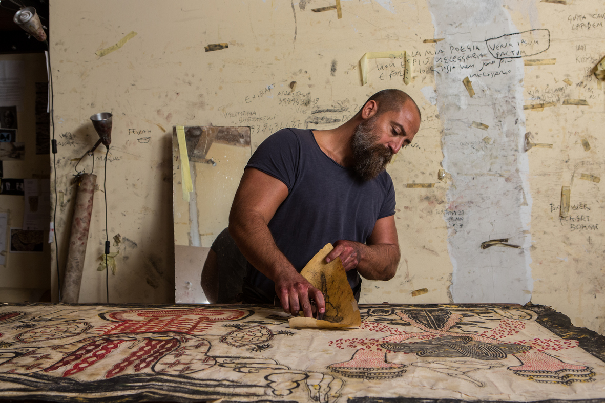 Il processo compositivo inizia già dalla creazione del supporto delle opere, che Pellegrini realizza partendo dalla carta vergine, ridotta in piccole parti e poi ricomposta con la colla, per ottenere una nuova e sempre irripetibile base di lavoro. Ogni matrice cartacea realizzata dall’artista – disegnata a carboncino, colorata con pigmento e infine unta a olio per permettere la corretta trasposizione dei motivi – crea una singola forma ed è utilizzata una sola volta e poi gettata, generando così elementi unici. Accostati gli uni agli altri, i segni impressi sui grandi fogli formano cartografie visionarie e atemporali che evocano iconografie mistiche, paesaggi arcaici, cosmogonie, antichi codici alchemici, esoterici, mitologici. Le grandi carte di Pellegrini sono il lento sviluppo di una grammatica simbolica in cui ogni elemento entra in dialogo con gli altri. Scie di organismi cellulari, forme di vita fitomorfe, segmenti di creature antropomorfe si frammentano o si fondono acquistando nuova vita.