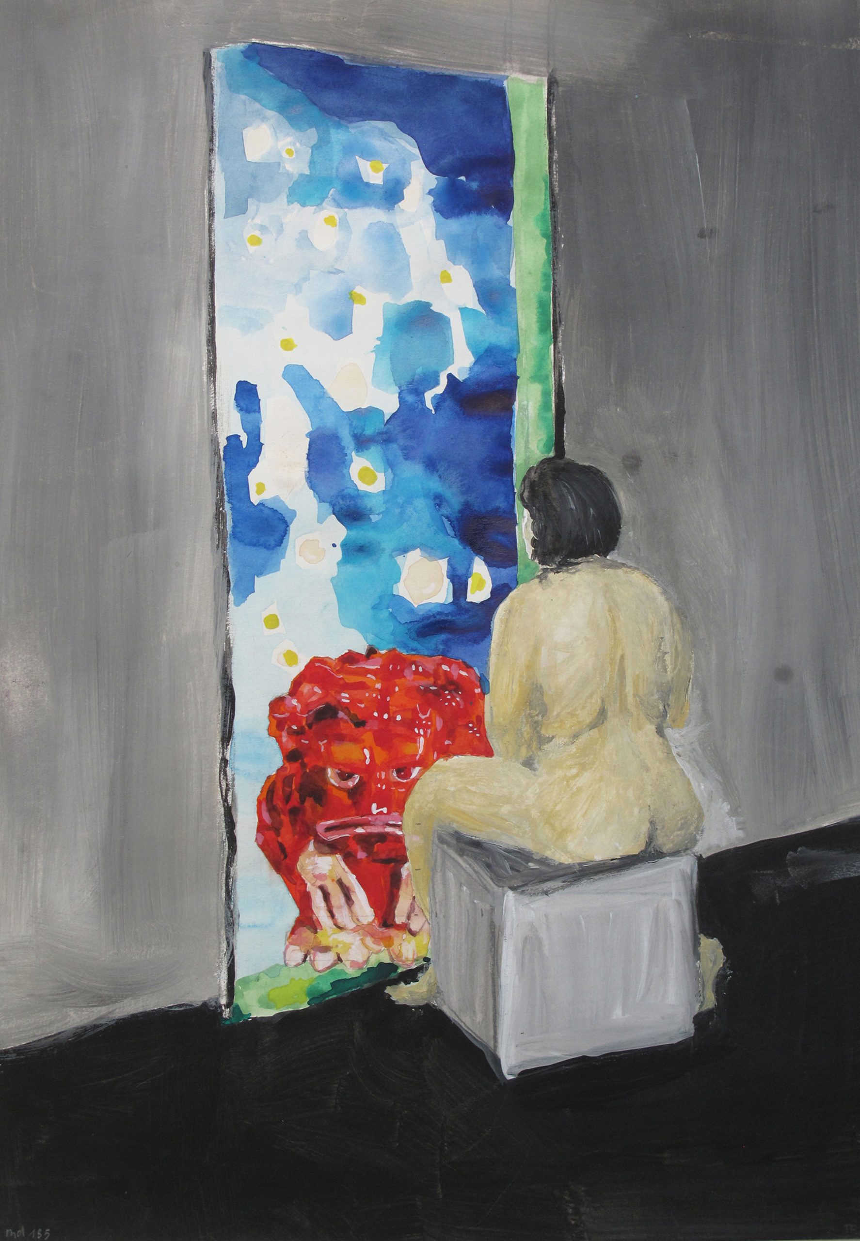 Bild oben: Tom Fellner, Monster Drawing 185 (The Long Wait), 2020, Bleistift, Wasserfarbe und Gouache auf Papier (mit Anne Fellner, 2008), 40 x 30 cm