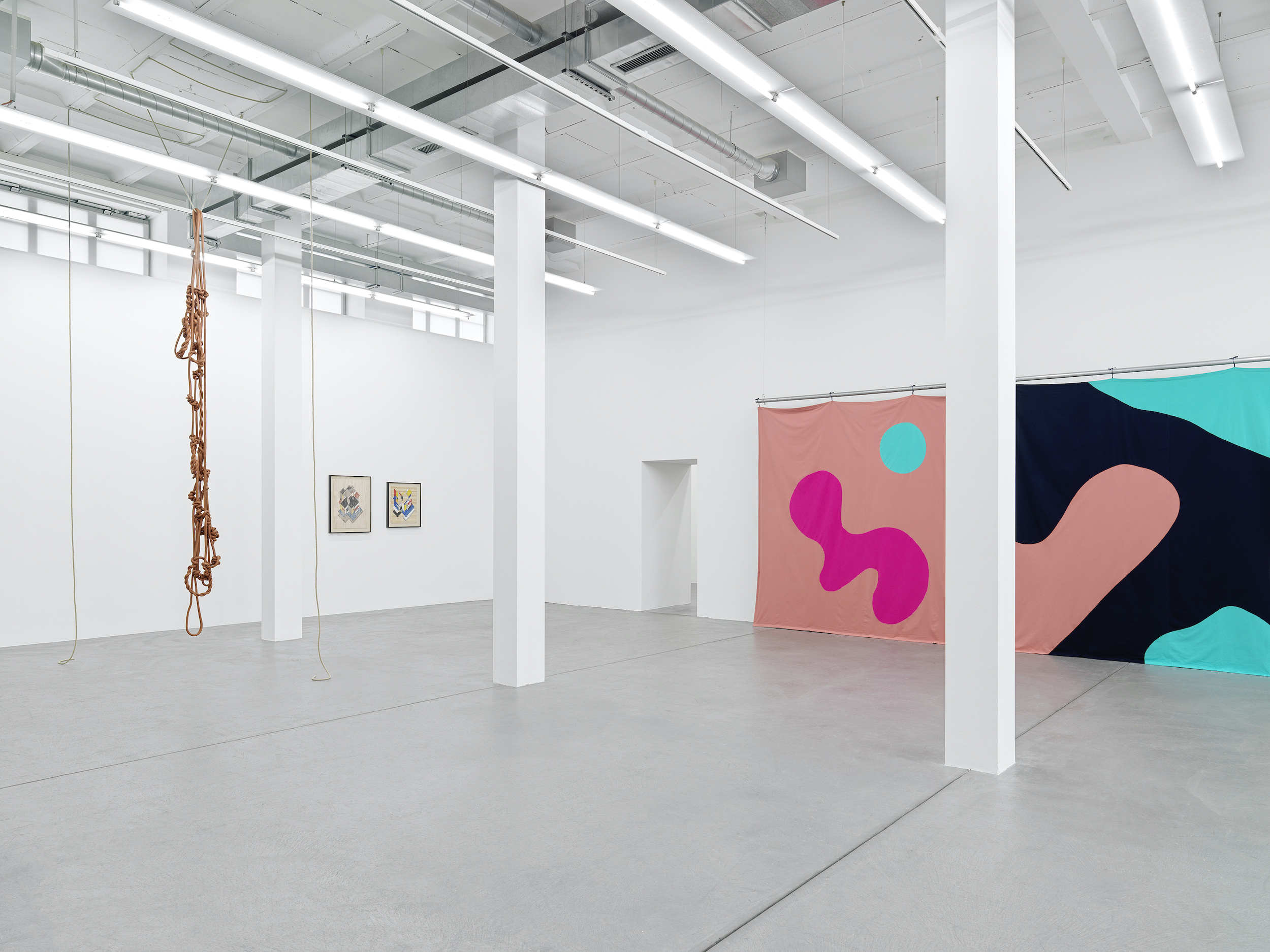 Sonia Kacem (geb. 1985 in Genf, lebt und arbeitet ebd.) arbeitet skulptural und installativ. Angeregt durch Impulse der Minimal Art etwa oder der arabisch-islamischen Kunst, interessiert sich Kacem für verschiedene Spielarten von Abstraktion, für die Übergänge zwischen Fläche und Volumen oder auch für Fragen der Massstäblichkeit. Das zweiteilige Wandobjekt Bruxelles (2020/21), ausgestellt im zweiten Kabinett, steht emblematisch für die Beschäftigung der Künstlerin mit den genannten Themen. Kacem hat Massstab und das Volumen der beiden Objekte, die ursprünglich als voneinander unabhängige Arbeiten für eine Soloschau in Brüssel entstanden, harmonisiert. Die mit Markisenstoff bespannten Konstruktionen – die eine erstrahlt in Rot und Blau, die andere in Rot und Orange – scheinen in ihrer Farbigkeit den Dialog mit dem Publikum nachgerade provozieren zu wollen und halten, weit in den schmalen Raum ragend, die Betrachter:innen zugleich auf Distanz.
