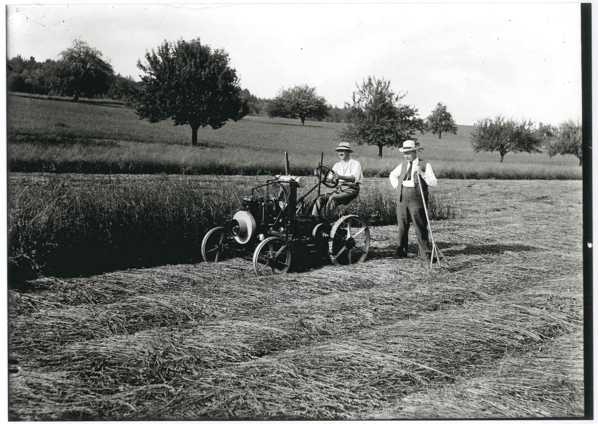Bild: Werbematerial der Landmaschinenfabrik Aebi in Burgdorf: Vorführung der Mähmaschine «Helvetia» 1915 auf dem Gut der Kartause Ittingen, mit Victor Fehr neben dem Maschinenführer – © https://kunstmuseum.tg.ch/