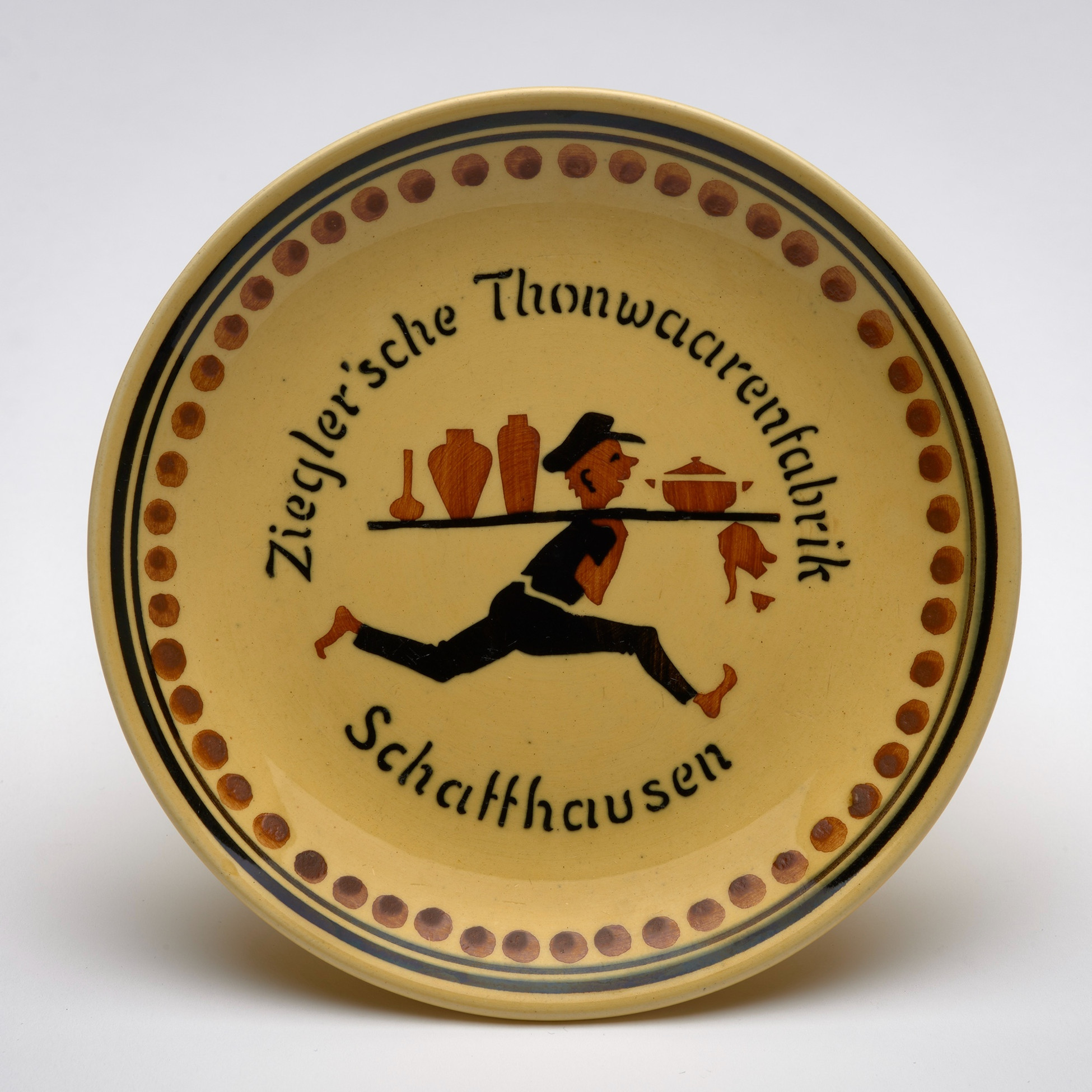Bild oben: Werbeteller «Ziegler’sche Thonwarenfabrik Schaffhausen», Steingut mit Schablonendekor, um 1900, Foto: Jürg Fausch