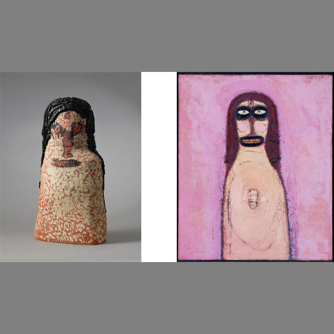 Bild links:Thomas Schlumpf, zuwebe, Terrakotta-Figur nach dem Gemälde «Madonna auf violettem Grund» von Hans Schärer – rechts: Hans Schärer, Madonna auf violettem Grund, 1969, Öl und andere Materialien auf Holzfaser, Kunsthaus Zug