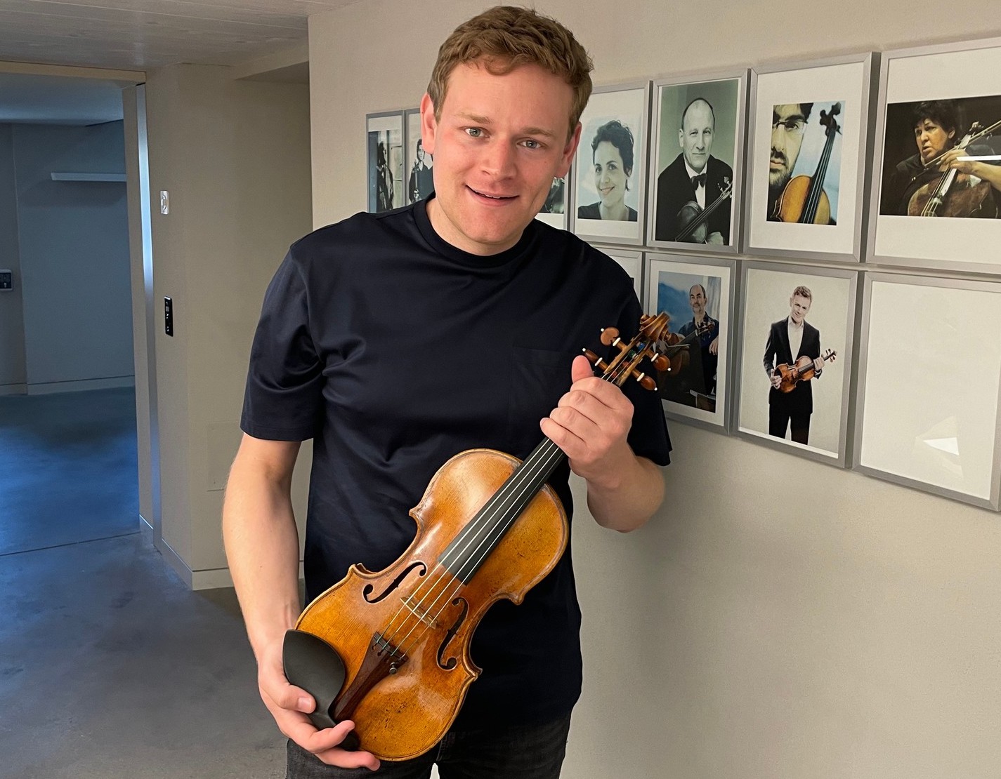 Bild: Sebastian Bohren ist diesjähriger Preisträger des «Goldenen Bogens». Hier steht er vor der «Wall of Fame» mit Bildern von Preisträgerinnen und Preisträgern der letzten 22 Jahre. In den Händen seine Guadagnini (und auf dem Foto hinter ihm: Thomas Füri – Preisträger 2005 – mit der selben Violine) – Foto: © https://www.facebook.com/geigenbauschule.ch/photos/a.680043275809353/1401231270357213/