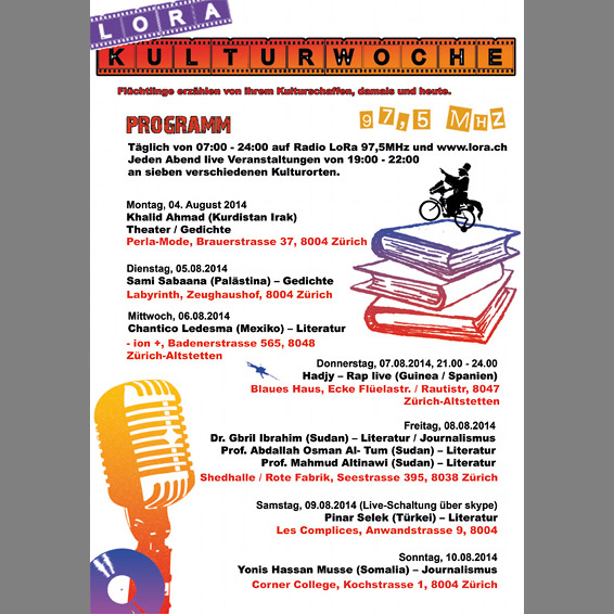Vom heutigen Montag bis zum Sonntag, 10. August 2014, findet auf 97.5MHz, «www.lora.ch» und abends an 7 Kulturorten der Stadt Zürich die «LoRa-Kulturwoche» statt. Dieses Jahr steht sie unter dem Titel «Stimmen aus dem Exil»: Flüchtlinge berichten über ihr Kulturschaffen, Kultur und Politik in ihren Heimatländern und in der Schweiz.