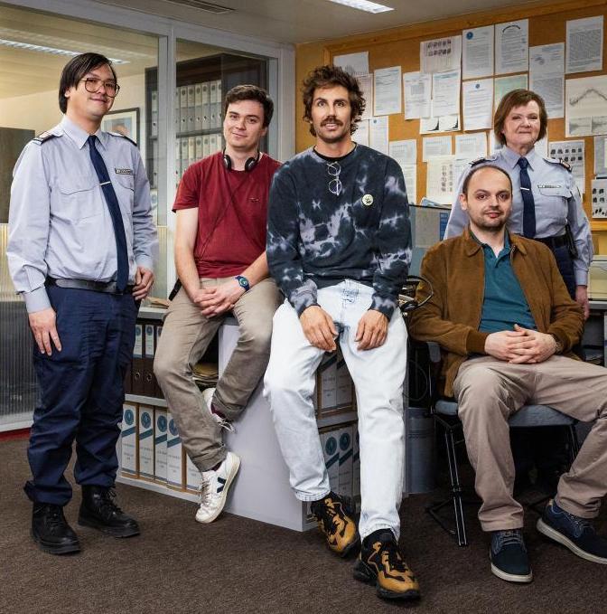 Bild: Beginn der Dreharbeiten von «Tschugger» Staffel 3 und 4, v.l. The Dah Ho als Peter, Regisseur Johannes Bachmann, David Constantin als Bax, Dragan Vujic als Pirmin und Ida Häfliger als Ida – Foto: © SRF / Dominic Steinmann