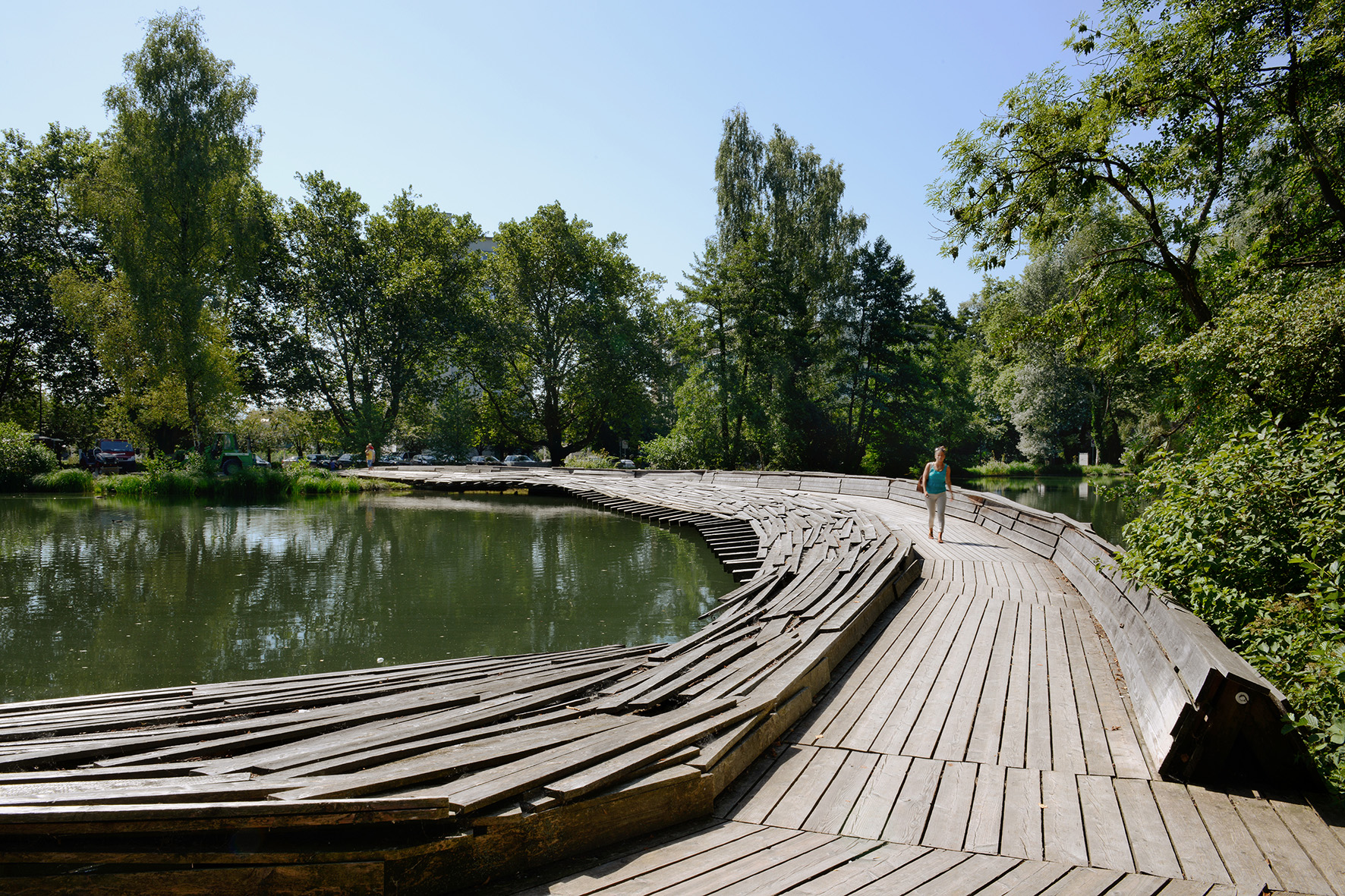 Bild: Tadashi Kawamata (*1953): «Drift Structure», 2010, Damm über den Zellweger-Weiher – Foto: Schweizer Heimatschutz
