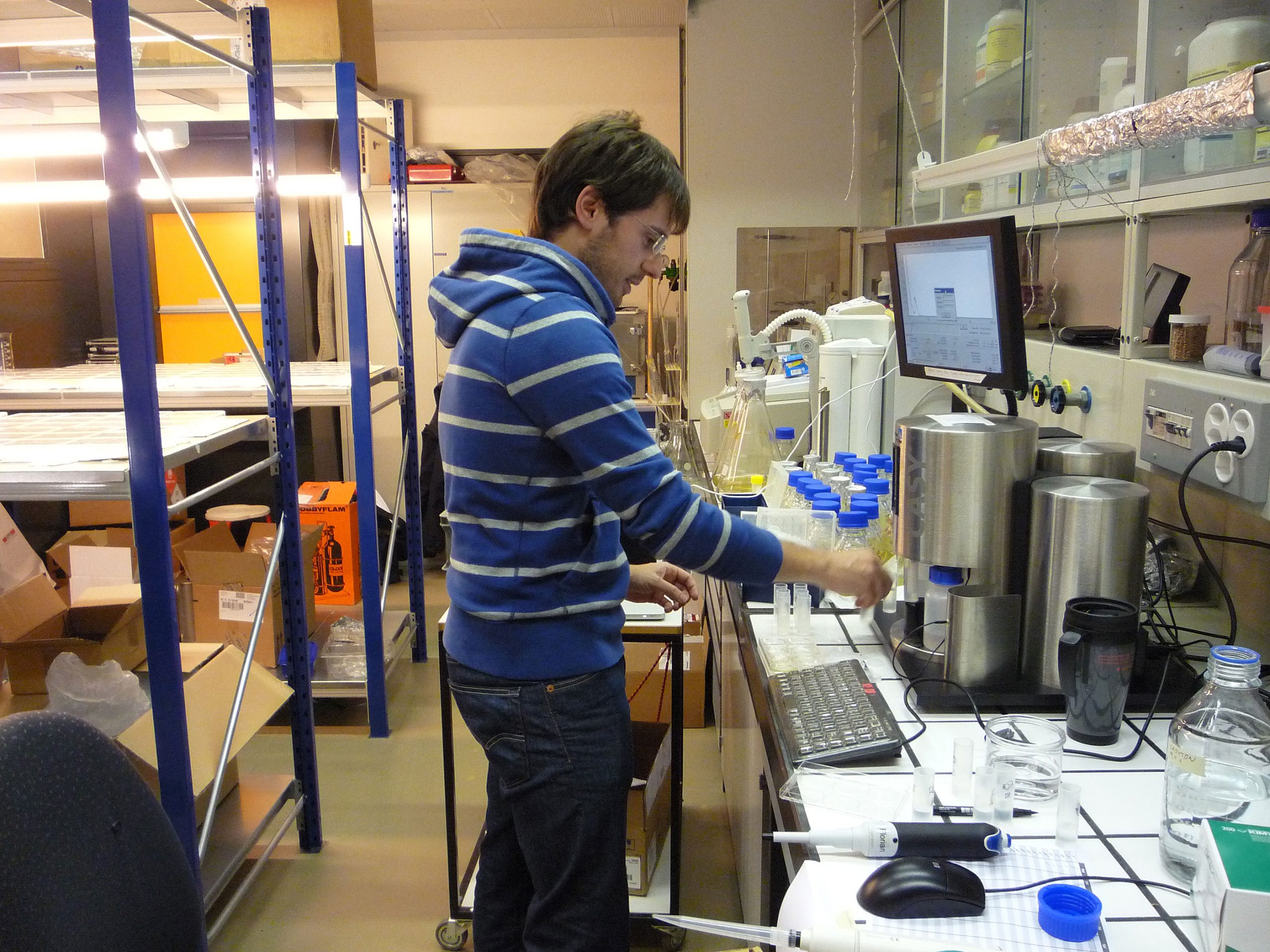 Bild: Andrea Giometto am CASY-Zähler, dem Instrument, um Grössenverteilungen von Organismen zu ermitteln.