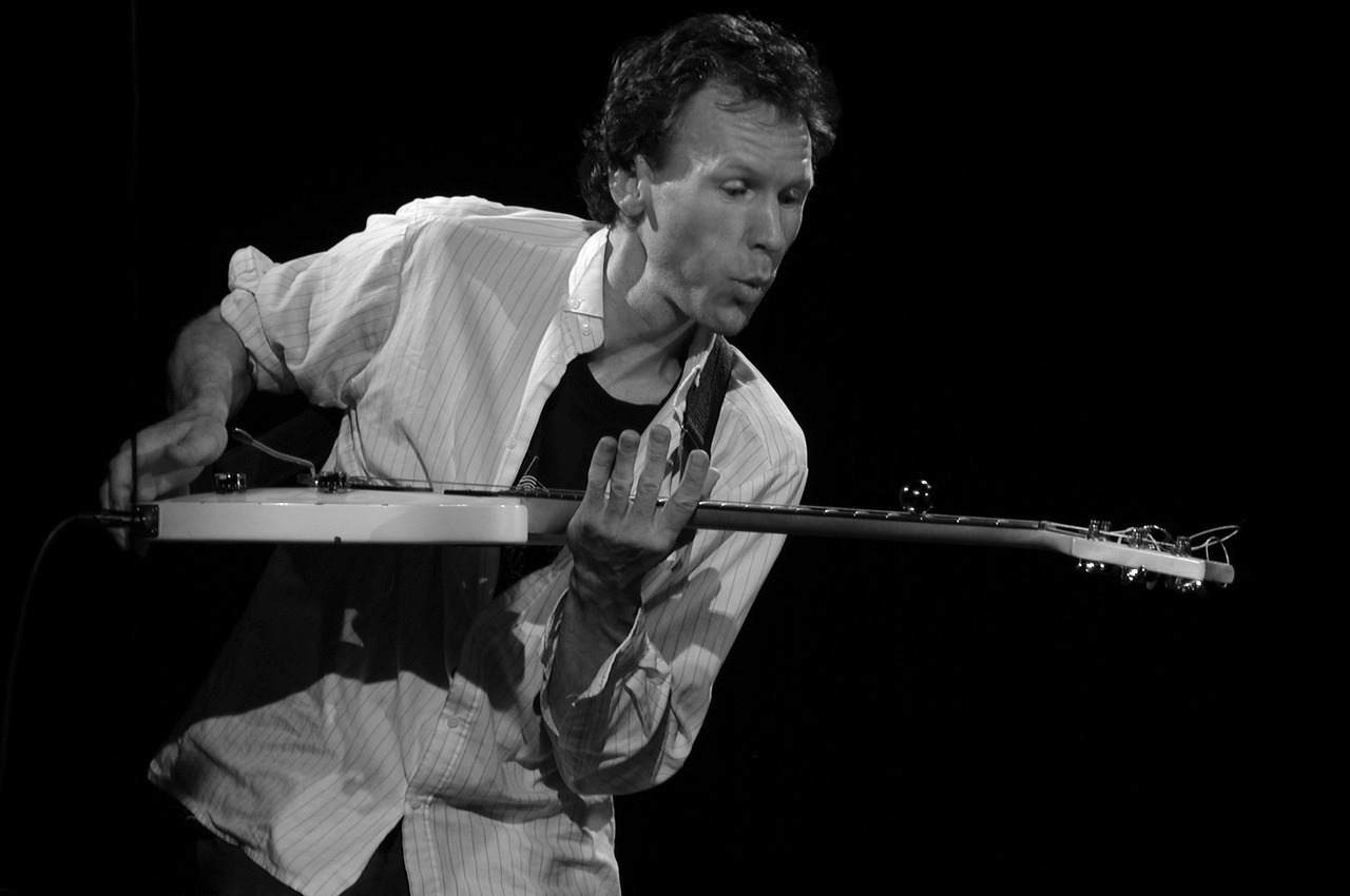 He possesses an extraordinary personal voice. The sounds of his «metaguitare» triturated with beads, foam, bows (non exhaustive list) confuse, surprise, cajole and expand the range of the instrument. Micro-textures, melodies and grooves spread the word. His guitar is plucked, painted, beaten, howling on a marble chirp, dizzying, unique, objects vibrating on the strings, producing astonishing  unheard sounds, through a deep, intense, even brutal play, opening the door to imagination and poetry.